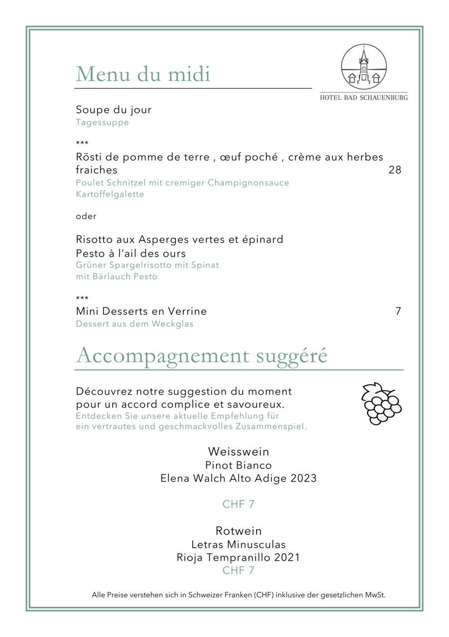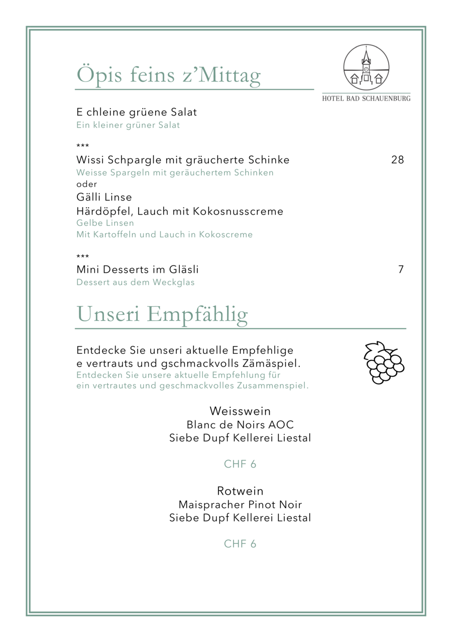Im Hauptgebäude werden Sie über den Mittag in der Brasserie Bad Schauenburg (Klassische Französische Küche) verwöhnt und im Economiegebäude befindet sich das urchige Bistro Zum Schauenegg (authentische regionale Landküche). Beachten Sie auf unserer Website die Öffnungszeiten der beiden Lokale.